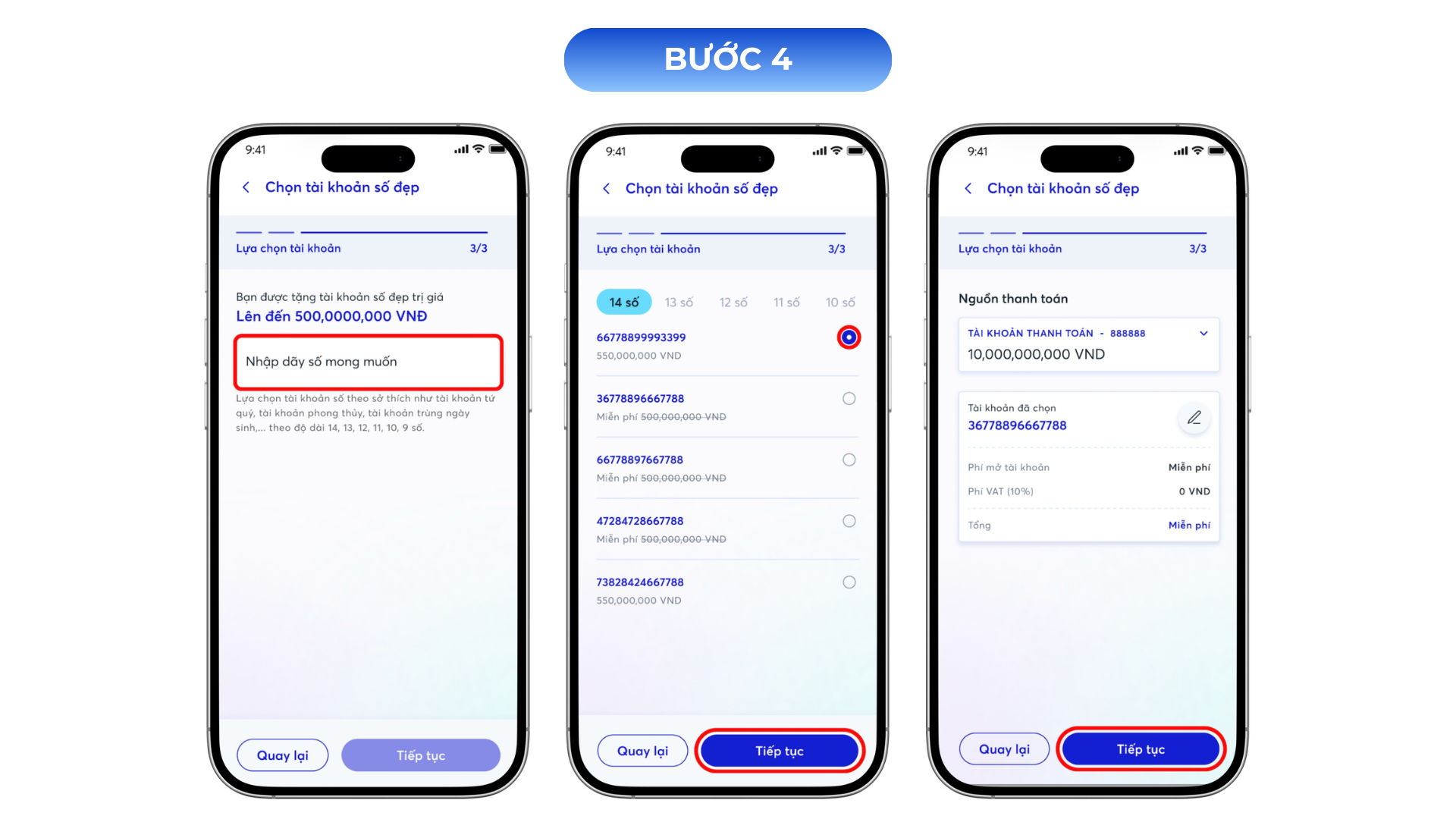 Bước 4: Lựa chọn Tài khoản số đẹp, ưu đãi trị giá lên đến 500 triệu đồng. Nhập dãy số mong muốn vào ô tìm kiếm → Xác nhận Tài khoản số đẹp muốn chọn và chọn Tiếp tục